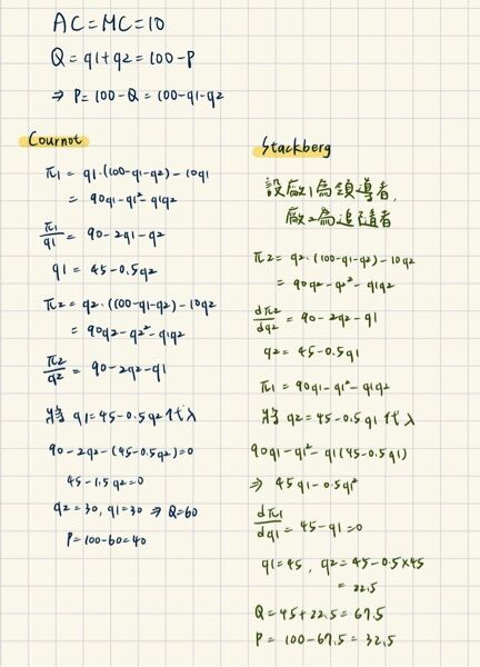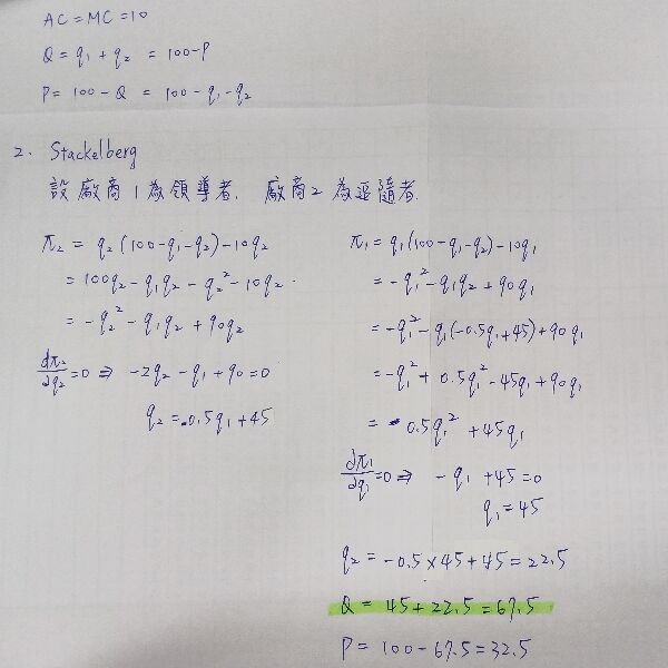 為 Q=q1+q2=100-P。下列敘述何者錯誤?