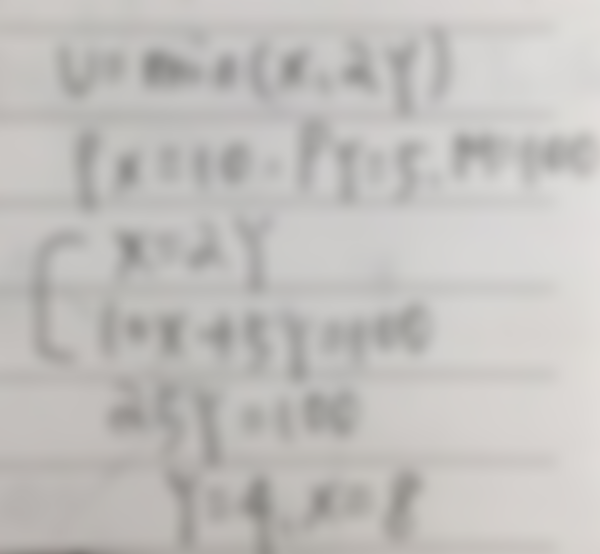7 某人對 X 與 Y 的效用函數為 U=min{X, 2Y}。若 X 與 Y 的價格分別為 10 與 5 且所得為 100,則