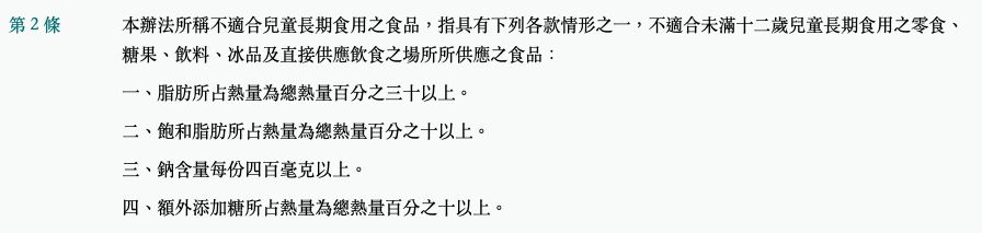 第二條 本辦法所稱不適合兒童長期食用之食品,指具有下列各款情形之一,不適合未滿十二歲兒童長期食用之零食、糖果、飲料、冰品及直接供應飲食之場所所供應之食品: