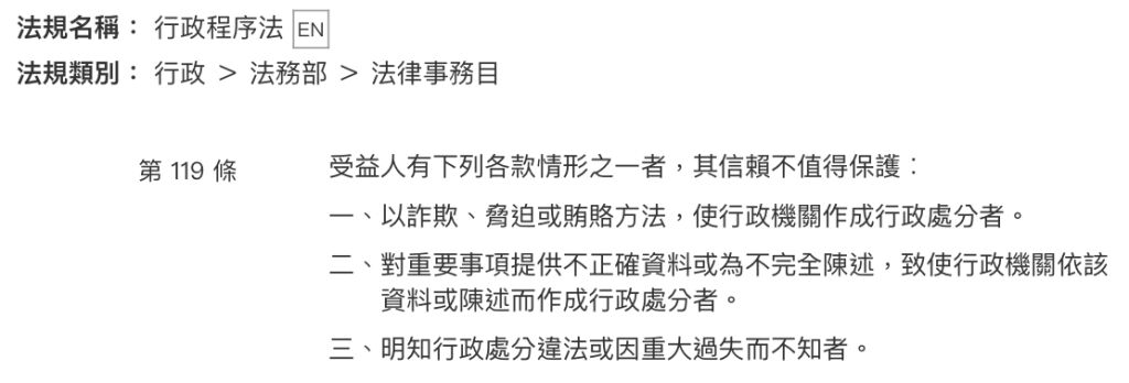 2.即使行政機關在特定情形下有故意或過失,其仍可能適用信賴保護原則,但故意或過失本身並非適用信賴保護原則的要件。