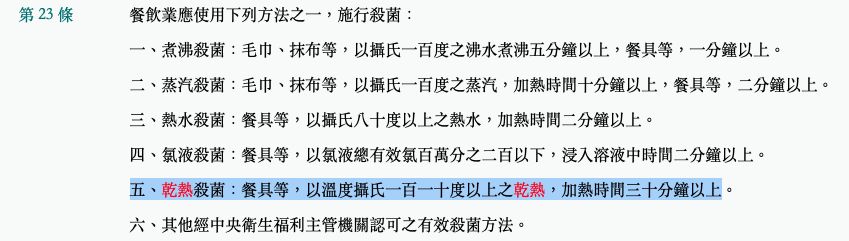 1 依據食品良好衛生規範準則,餐飲業者若以乾熱殺菌法對餐具進行殺菌處理,其條件為何?