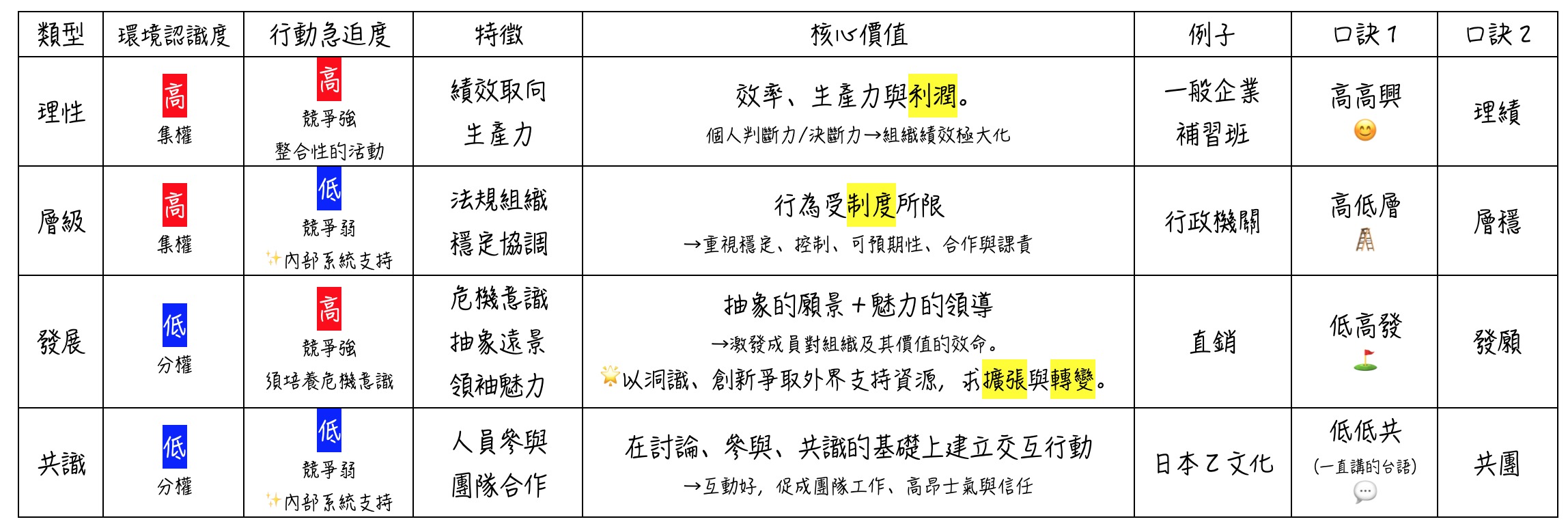 1. 理性的文化(Rational Culture):對環境認識的程度高、組織行動急迫性高