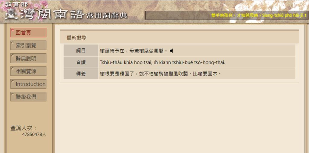 資料來源:https://twblg.dict.edu.tw/holodict_new/result_detail.jsp?n_no=60354&curpage=0&sample=%E6%A8%B9%E9%A0%AD%E5%BE%9B%E4%BA%88%E5%9C%A8%EF%BC%8C%E6%AF%8B%E9%A9%9A%E6%A8%B9%E5%B0%BE%E5%81%9A%E9%A2%A8%E9%A2%B1%E3%80%82&radiobutton=0&querytarget=0&limit=1&pagenum=0&rowcount=0