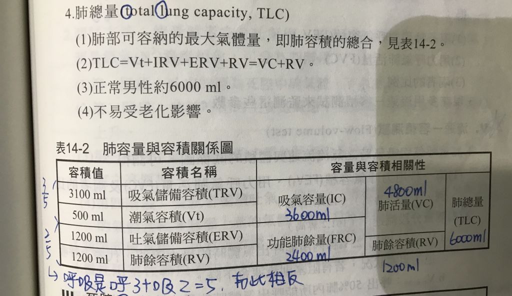 1.張先生肺功能的吸氣儲備容積(inspiratory reserve volume)2,000毫升,潮氣容積(tidal volume)500毫