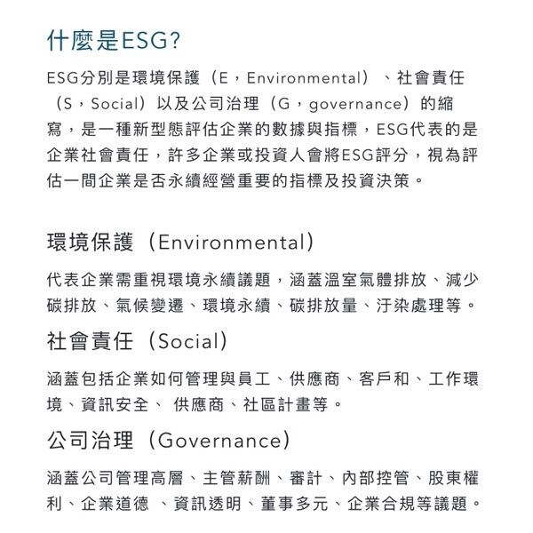展藍圖」。請問 ESG 所指的是下列何者?