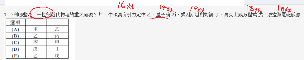 1. 下列哪些為二十世紀近代物理的重大發現? 甲、牛頓萬有引力定律 乙、量子論 丙、愛因斯坦相對論 丁、馬克士威方程式 戊、法拉第電磁感應