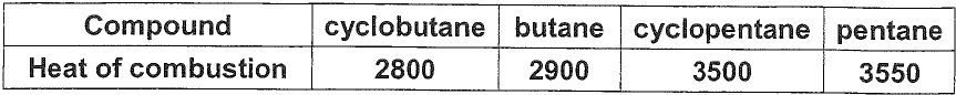 1. Using the following four data to estimate the ring strain in cyclobutane (ΔE₁) and cyclopentane (ΔE₂). If heat of combustion (in kJ/mol) of following four compounds are:
