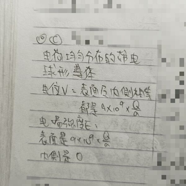 10 電荷均勻分布的帶電球形導體內部電位為V1,表面上之電位為V2,則: