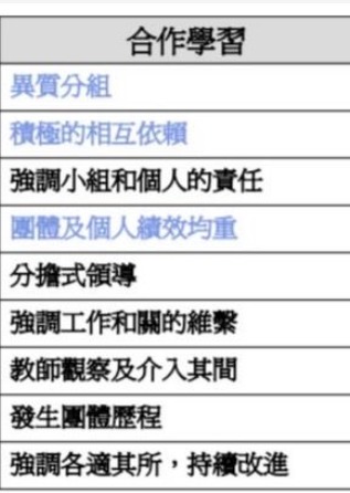 個別績效責任: 合作學習當中,小組的成功是界定在組內每一個人的成功,而不是以小組某一個成員的成功來代表小組,不顧其他成員的表現。