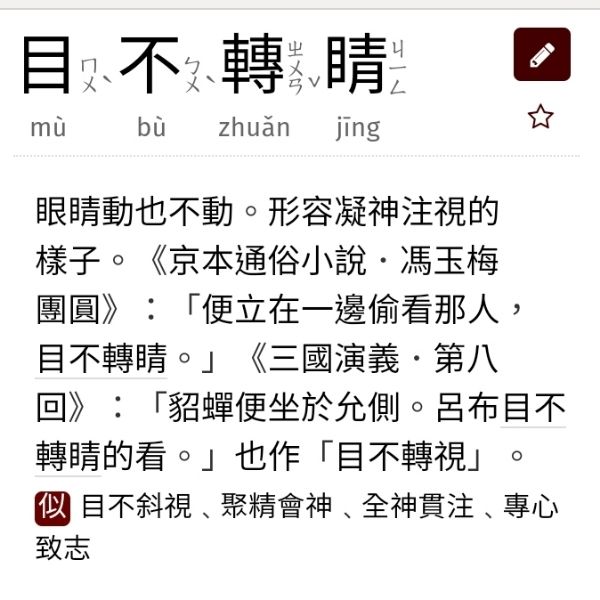 目不轉睛:眼睛動也不動。形容凝神注視的樣子。