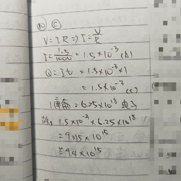 10 以導線將一個 1.5 V 的電池連接到一個1kΩ的電阻,則在1秒鐘內會有多少電子流經此電阻?