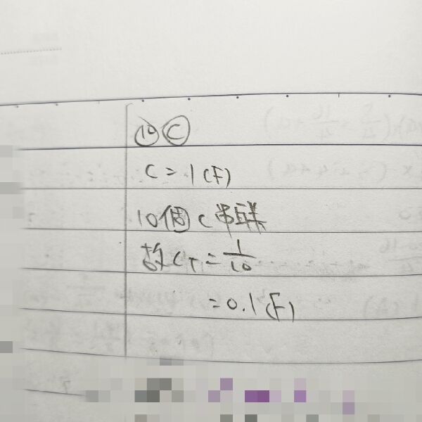 10 將 10 個相同的電容串接在一起,設每個電容器皆為 1 F,則我們會得到多大的電容值?