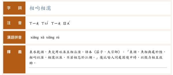 10. 《莊子‧大宗師》:「泉涸,魚相與處於陸,相呴以濕,相濡以沫,不