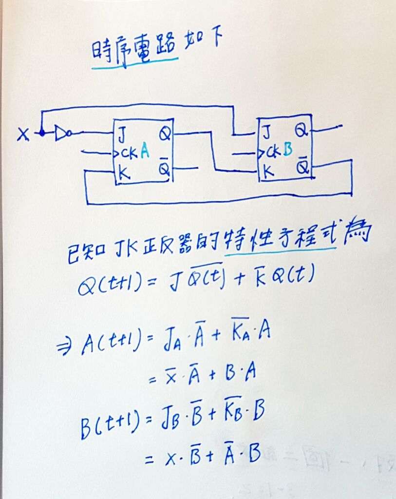 10 一時序電路經由兩個JK正反器所組成,其中A、B代表狀態,x代表外部輸入,JA與KA代表第一個JK 正 反 器 之 輸 入 , JB 與 KB 代 表 第 二 個 JK 正 反 器 之 輸 入 , 此 時 序 電 路 有 下 列 的 關 係 式
