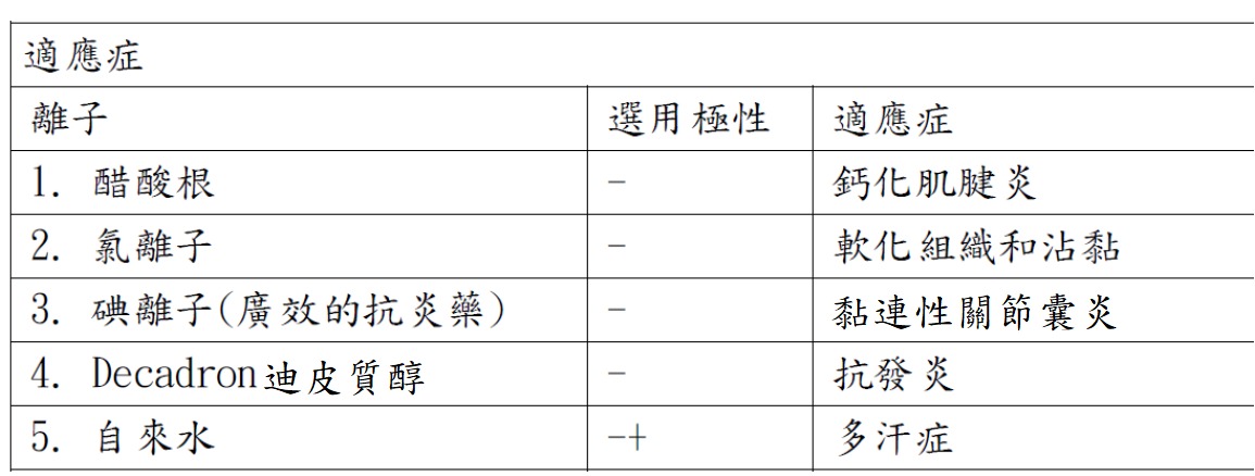 10.關於離子電泳法常使用之藥物、選用極性、適應症,下列敘述何者正確?