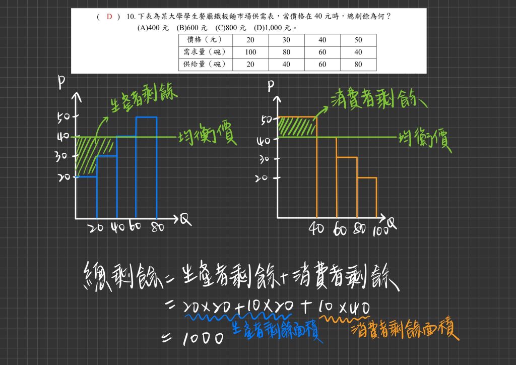回到定義看,其實課本最一開始都有說線都是階梯狀,不同願付價格消費者進入市場後需求線跟供給線才變平滑。以這題考古題來看,題目提供的表格相當於個別消費者,所以畫的圖型應畫成階梯狀。