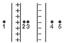 10. As shown in the following, two large insulating parallel plates carry positive charge of equal magnitude, one positive and the other negative, that is distributed uniformly over their inner surfaces. Rank the points 1 through 5 according to the magnitude of the electric field at the points, least to greatest.
