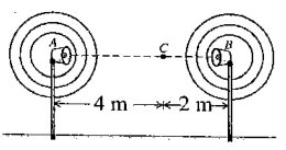 10.Two speakers radiate sound uniformly in all directions. The sound speed is 340 m/s. Both speakers are vibrating in phase at a frequency of 170 Hz and both have output power of 16xn watt. A listener is standing at point C, which is 4 m away from speaker A and 2 m from speaker B. What is the intensity at C when both speakers are turned on?