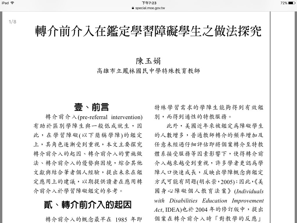 轉介前介入(pre-referral intervention)有助於區別學障生與一般低成就生,因 此,在學習障礙(以下簡稱學障)的鑑定 上,其角色逐漸受到重視,