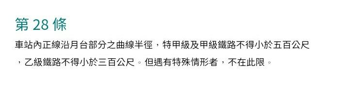 106. 車站內正線沿月台部分之曲線半徑,特甲級及甲級鐵路不得小於幾公尺。(第 28 條)