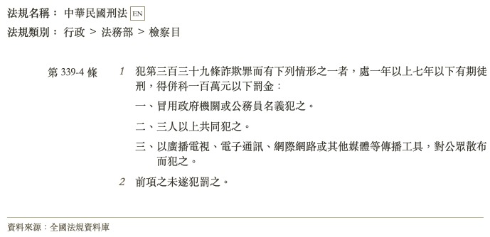 犯第三百三十九條詐欺罪而有下列情形之一者,處一年以上七年以下有期徒刑,得併科一百萬元以下罰金: