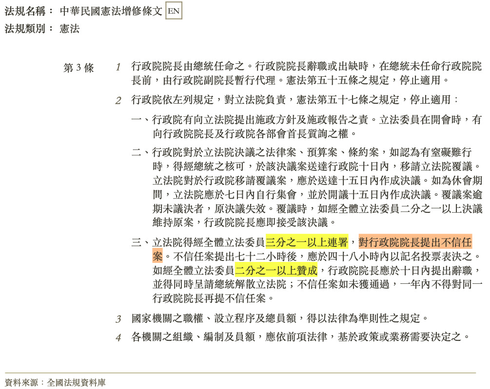中華民國憲法增修條文第三條第二項第三款規定:「行政院依左列規 定,對立法院負責,……三、立法院得經全體立法委員三分之一以上連署 ,對行政院院長提出不信任案。不信任案提出七十二小時後,應於四十八 小時內以記名投票表決之。……」旨在規範不信任案應於上開規定之時限 內,完成記名投票表決,避免懸宕影響政局安定,未限制不信任案須於立 法院常會提出。憲法第六十九條規定:「立法院遇有左列情事之一時,得 開臨時會:一、總統之咨請。二、立法委員四分之一以上之請求。」僅規 範立法院臨時會召開之程序,未限制臨時會得審議之事項。是立法院於臨 時會中審議不信任案,非憲法所不許。立法院組織法第六條第一項規定: 「立法院臨時會,依憲法第六十九條規定行之,並以決議召集臨時會之特 定事項為限。」與上開憲法規定意旨不符部分,應不再適用。如於立法院 休會期間提出不信任案,立法院應即召開臨時會審議之。