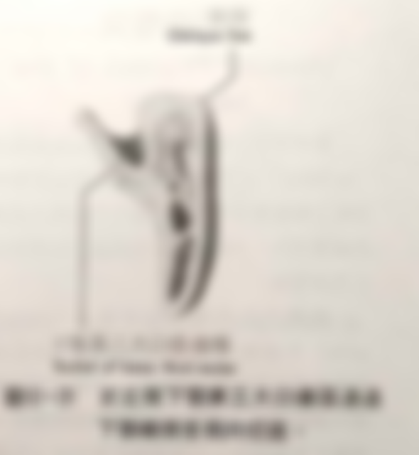 11.如下圖所示為下顎頰舌側向切面圖,下列那一顆牙齒最可能為位在圖中所指的齒槽中?