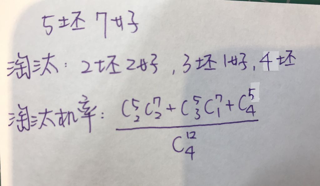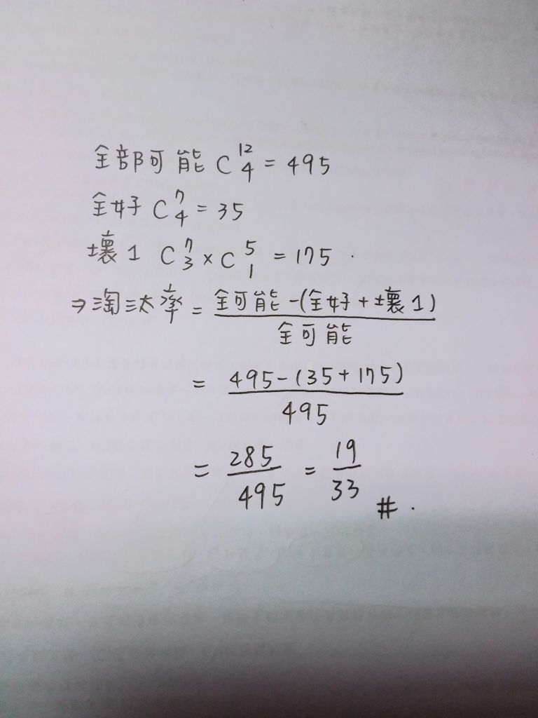 11. 有一家工廠生產燈泡,12個裝成一盒。工廠品質檢驗的方法是從每盒中任取4個來檢查,如有兩個或兩個以上的燈泡是壞的,則整盒淘 汰。若某一盒有5個壞燈泡,則這一盒會被淘汰的機率是?