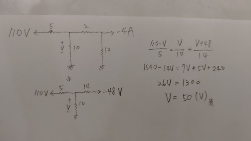 (V-110 )/5+V/10+(V-V')/2=0