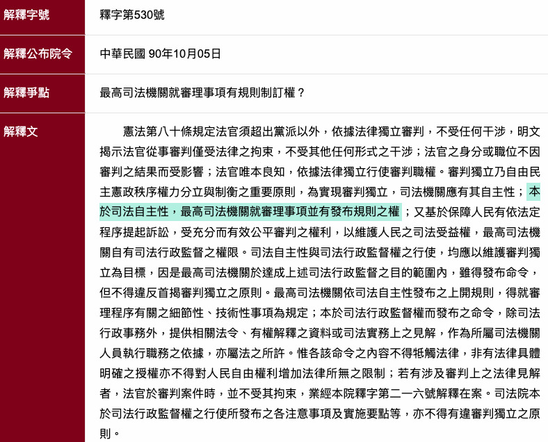 【釋字530】最高司法機關就審理事項有規則制訂權? : 基於自由民主憲政秩序與權力分立制衡原則,法官依法行使獨立審判權;司法機關具備自主性,最高司法機關就審理事項並有發布規則之權得就審理程序有關之細節性、技術性事項為規定;本於司法行政監督權而發布之命令,除司法行政事務外,提供相關法令、有權解釋之資料或司法實務上之見解,作為所屬司法機關人員執行職務之依據,亦屬法之所許。