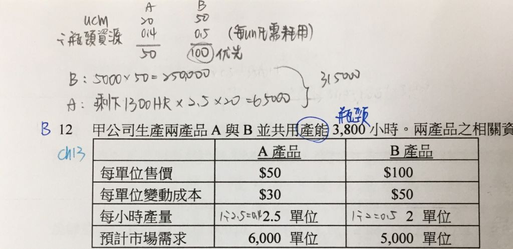 12 甲公司生產兩產品 A 與 B 並共用產能 3,800 小時。兩產品之相關資料如下: