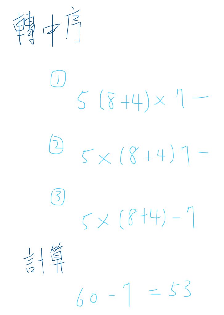 後序表示( 左 / 右 / 根) => 即為 運算元, 運算元, 運算子