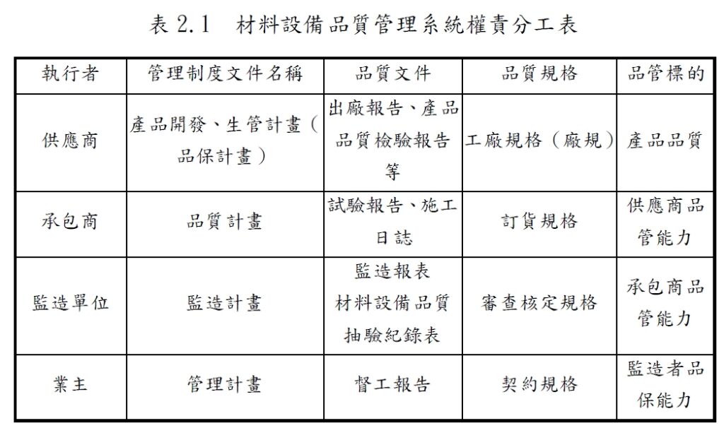 12. 依材料設備品質管理系統之權責分工,承攬廠商應關切的品質規格為