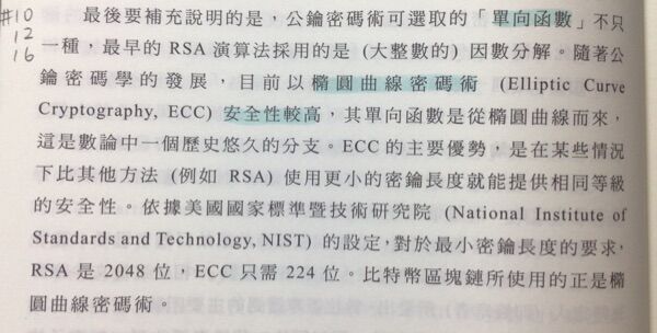 橢圓曲線密碼學(ECC):比特幣用的,公鑰密碼術,單向函數,透過私鑰生成公鑰,透過公鑰驗證私鑰,但難以從公反推出私。