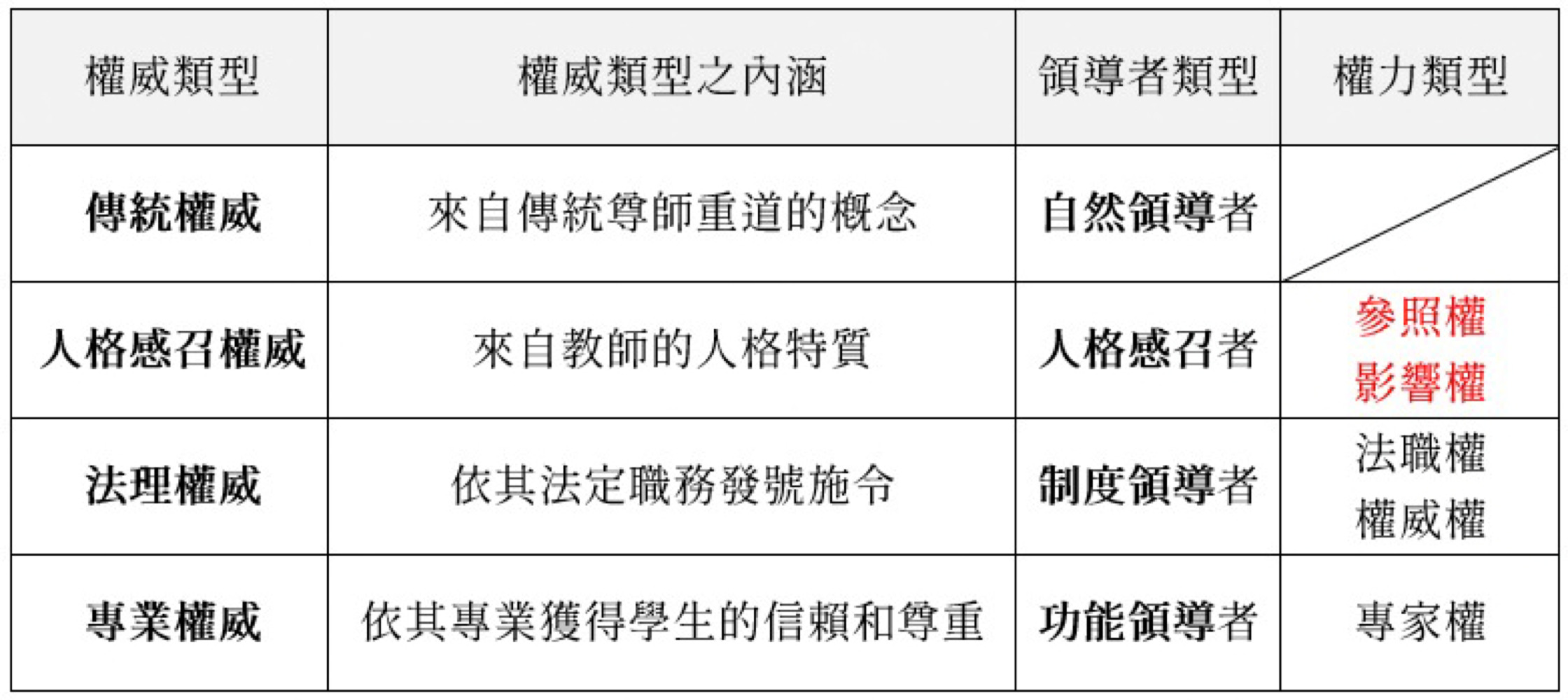 - (D) 親和權 → 親和權是指基於個人魅力或與他人建立良好關係所獲得的影響力,但這並不是方老師的主要權力來源,方老師的情況更多來自於專業能力而非個人魅力。❌