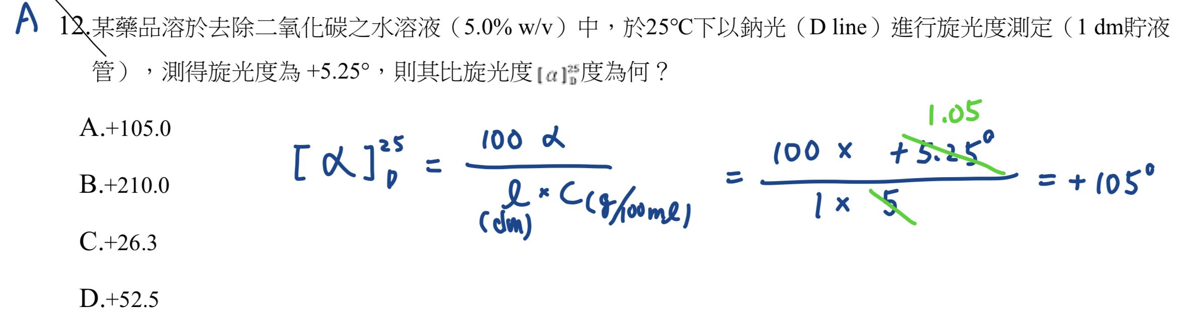 12.某藥品溶於去除二氧化碳之水溶液(5.0% w/v)中,於25℃下以鈉光(D line)進行旋光度測定(1 dm貯液 管),測得旋光度為 +5.25°,則其比旋光度