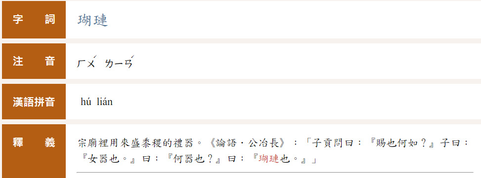 論語公冶長篇:「子貢問曰:『賜也何如?』子曰:『女器也。』曰:『何器也?』曰:『瑚璉也。』」