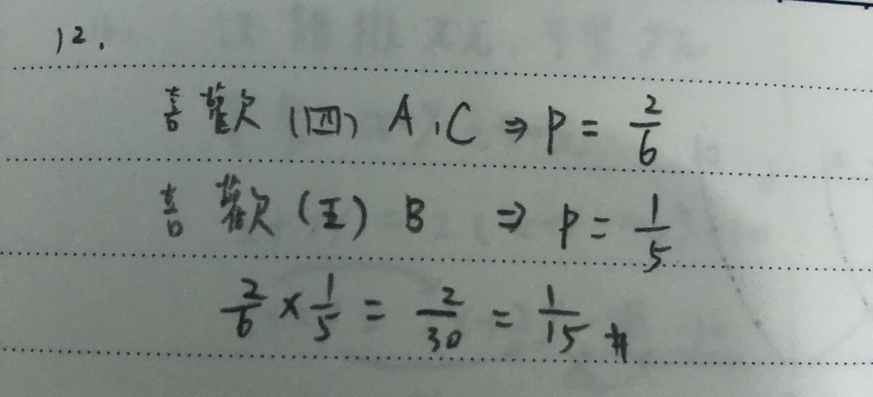 選中喜歡的動物與汽車的機率為1/3 x 1/5 =1/15
