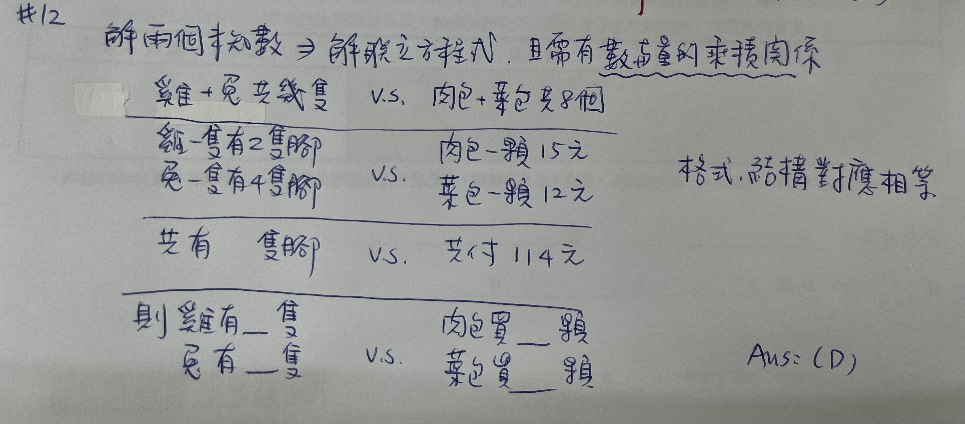 12. 若教師藉由「雞兔同籠」的問題,教過求解兩個數未知的數量關係後,想再命一個與「雞兔同籠」結構相似的問題讓學生練習,則下