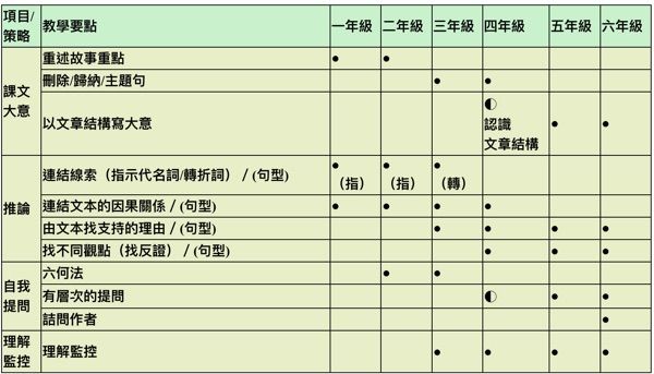 「自我提問」的策略於四年級開始認識有層次的提問,包括事實、推論、評論,但其中較難的評論層次應於高年級學習。