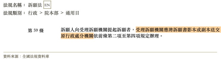 ↑錯誤:訴願法第 59 條「訴願人向受理訴願機關提起訴願者,受理訴願機關應將訴願書影本或副本送交原行政處分機關依前條第二項至第四項規定辦理。」