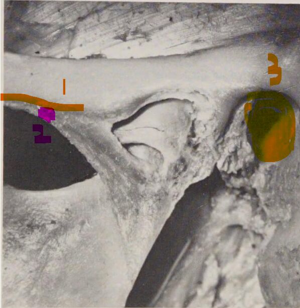 13 顳顎關節韌帶附著於顱底之圖示,若編號 3 之處代表為外耳道,則下列敘述何者為非?