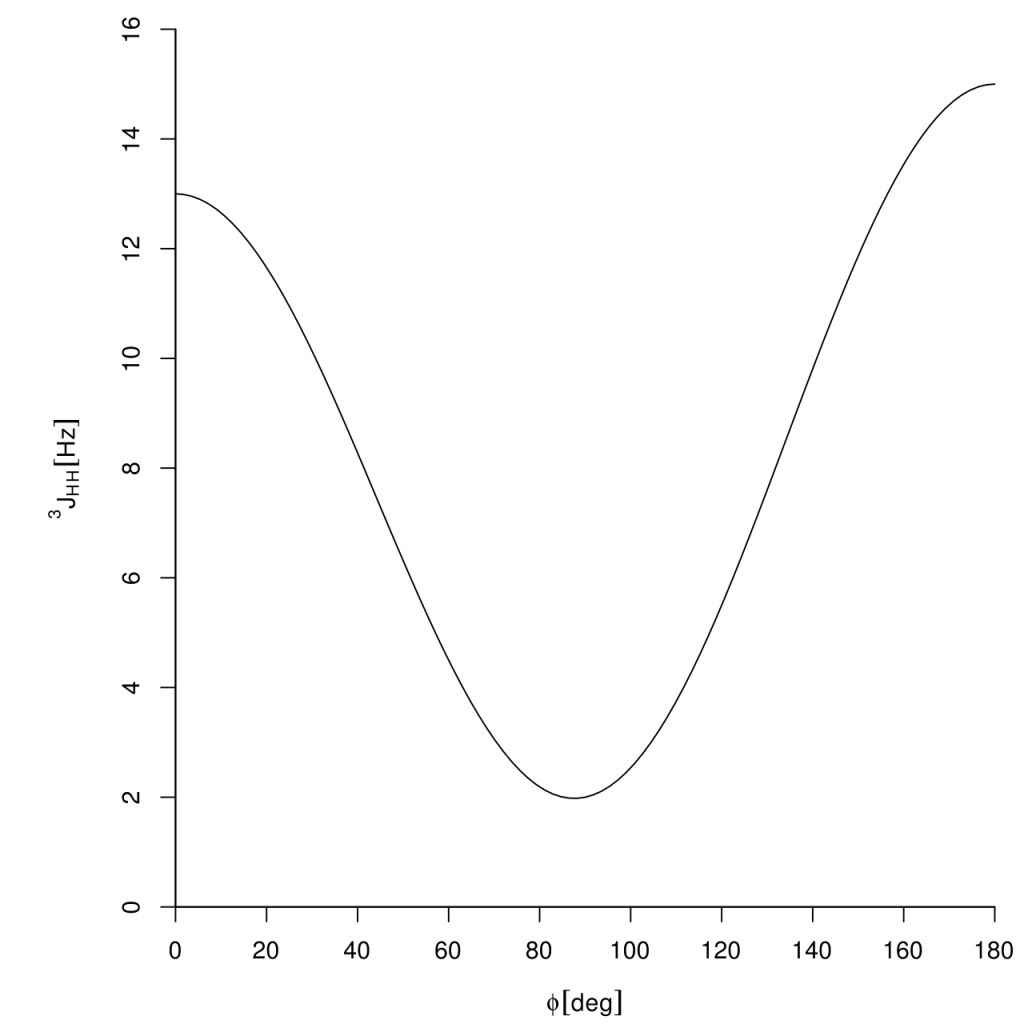 從這關係,我們就能知道最大值應發生在夾角 0 度或 180 度,其中夾角 180 度的 overlap 程度最高,所以 coupling constant 最大,下圖是一般 NMR 課程都會提到夾角與 coupling constant 大小的關係圖