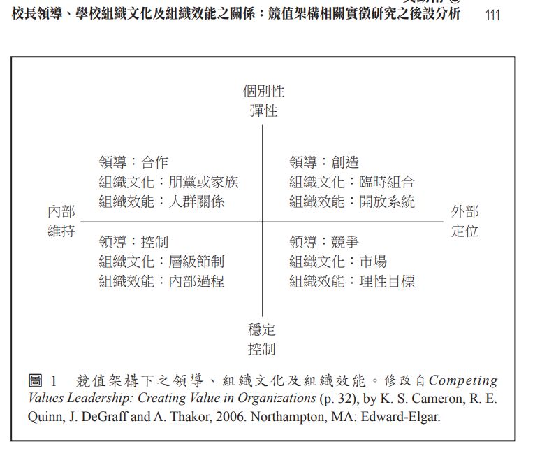 13.競值架構(Competing Values Framework)整合了組織中的四大理論,其中「開放系統模式」最適配的校長領導角色為以