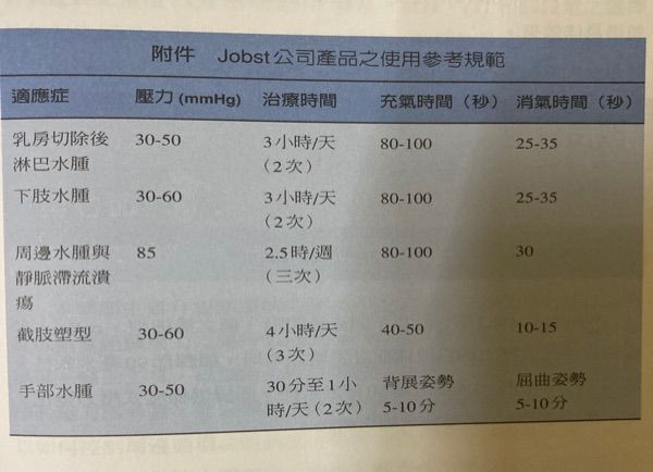 秒」 ②截肢塑型消腫,「充氣:40~60秒」、「消氣:10~15秒」 ③術後血栓靜脈炎的預防,「充氣: