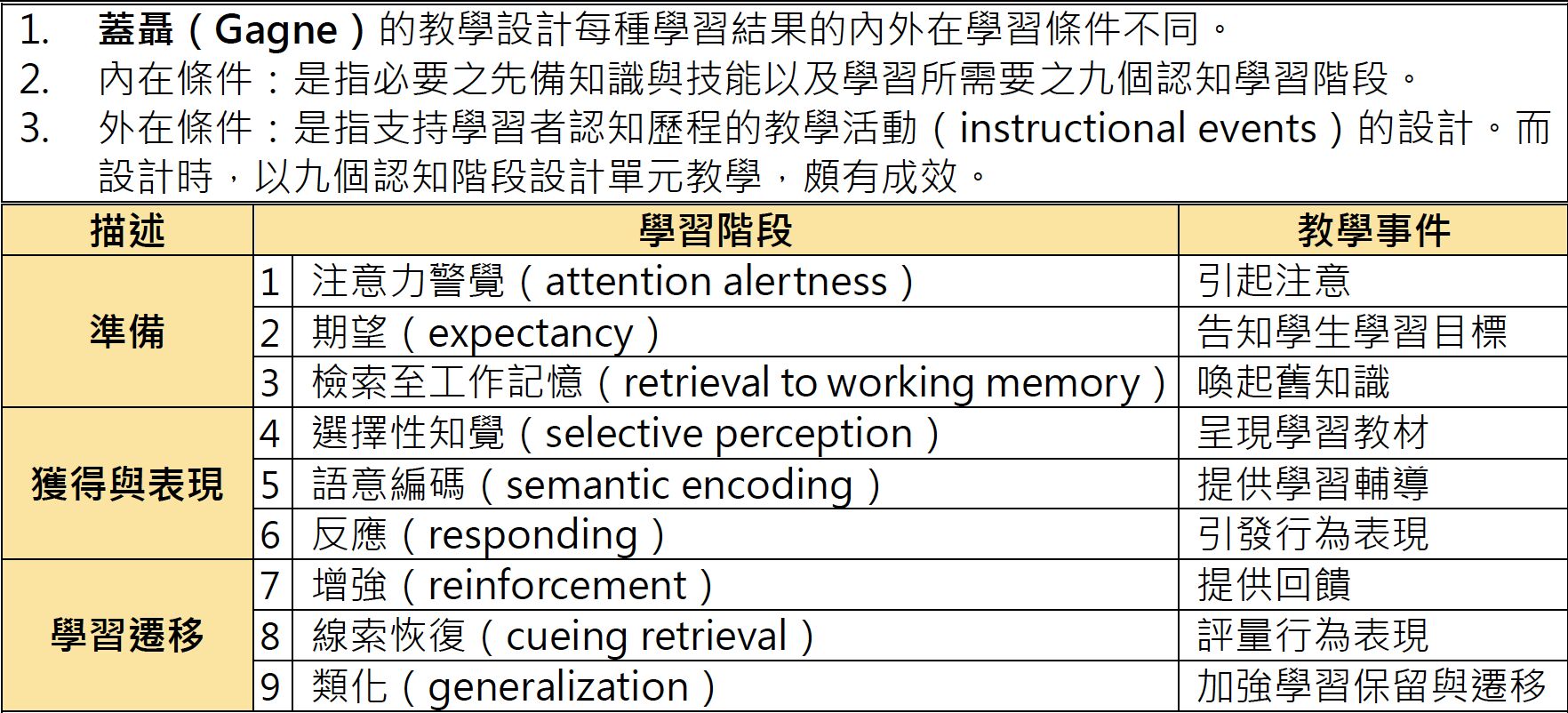 蓋聶 (Gagne) 教學理論著重於教師對學習情境的設計。他提出了有目標的教學設計,強調教師應根據學生的學習需求和能力水平,有系統地安排教學內容和策略,以達到預期的學習成效。蓋聶的理論中包含了九種教學事件,其中包括吸引學生的注意、呈現學習目標、刺激學生回憶先備知識、提供指導和練習機會,以及評量學習成果等步驟,以促進有效的學習。