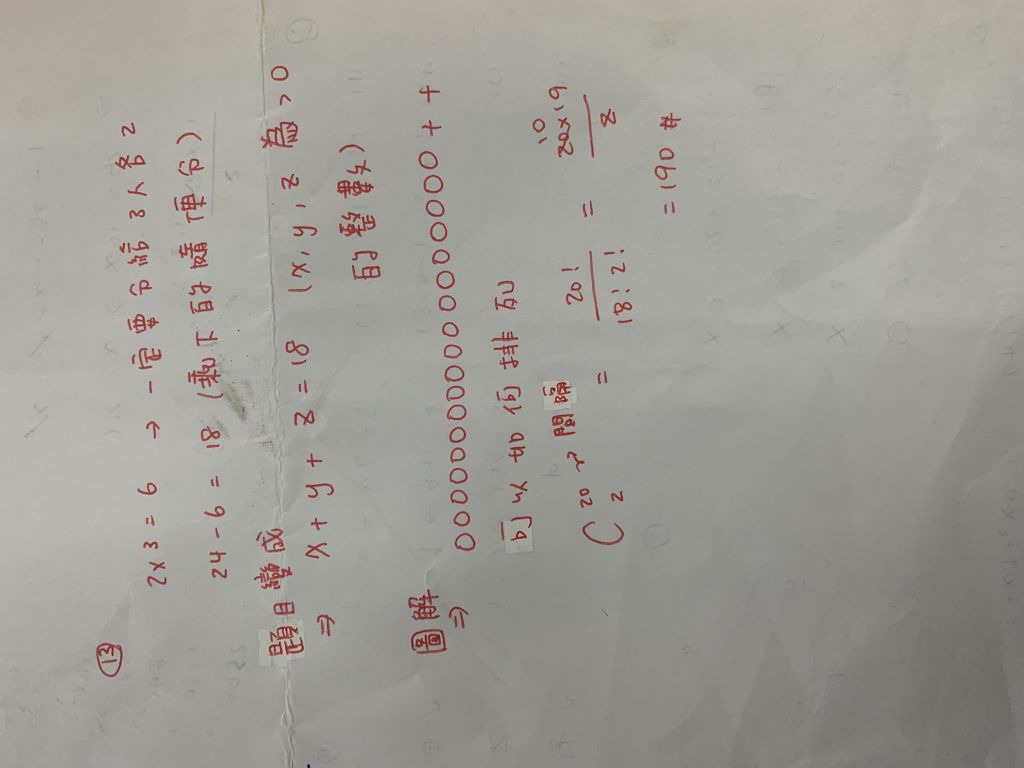 13. 小柚有24顆巧克力。試問她將巧克力與小新及小美分享使得他們三人每人至少有2顆巧克力的方法總共有多少種?