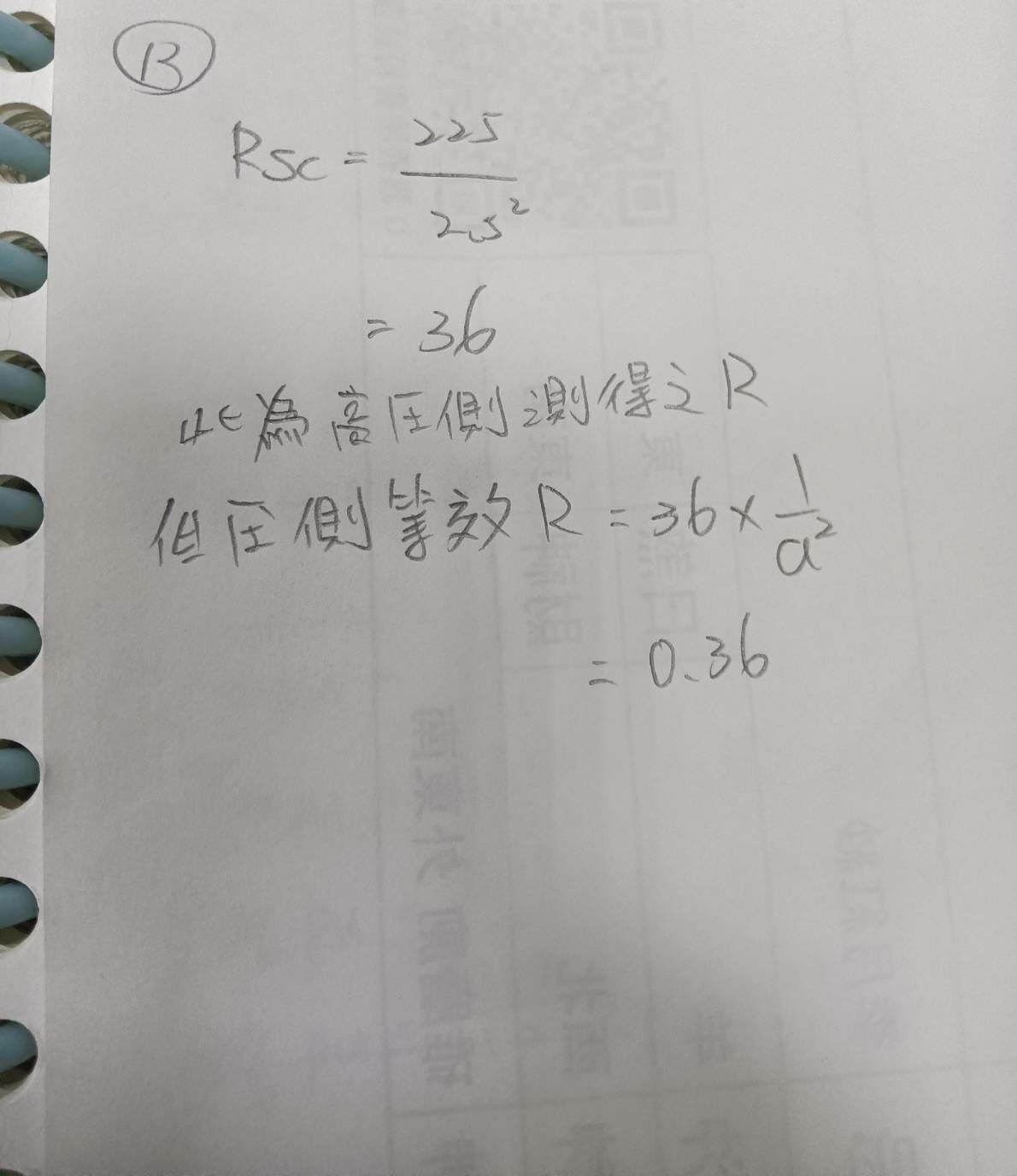 13. 有一部 4 kVA、1000 V / 100 V之單相變壓器,低壓側短路,於高壓側加電源進行測試,瓦特 表量測值為 225 W、電壓表為 125 V、電流表為 2.5 A,則低壓側等效電阻為何?