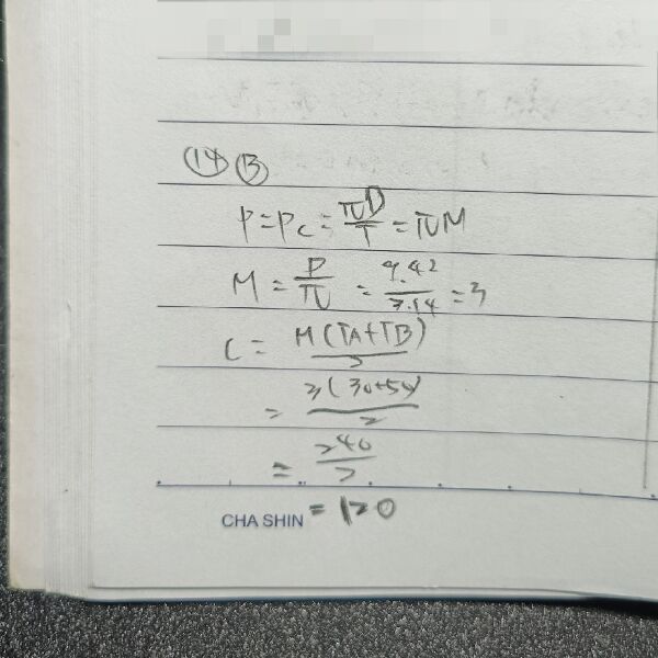 14 兩正齒輪嚙合,若齒數分別為 30 齒及 50 齒,其周節為 9.42 mm,則兩軸之中心距離為多少 mm?