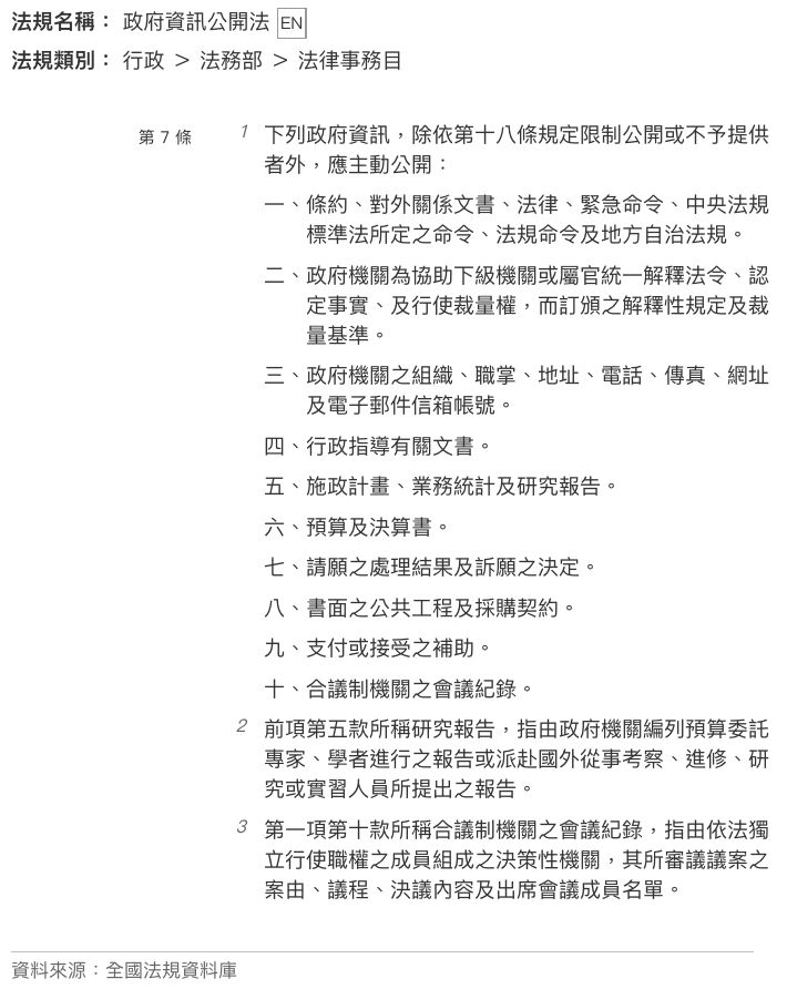 下列政府資訊,除依第十八條規定限制公開或不予提供者外,應主動公開: